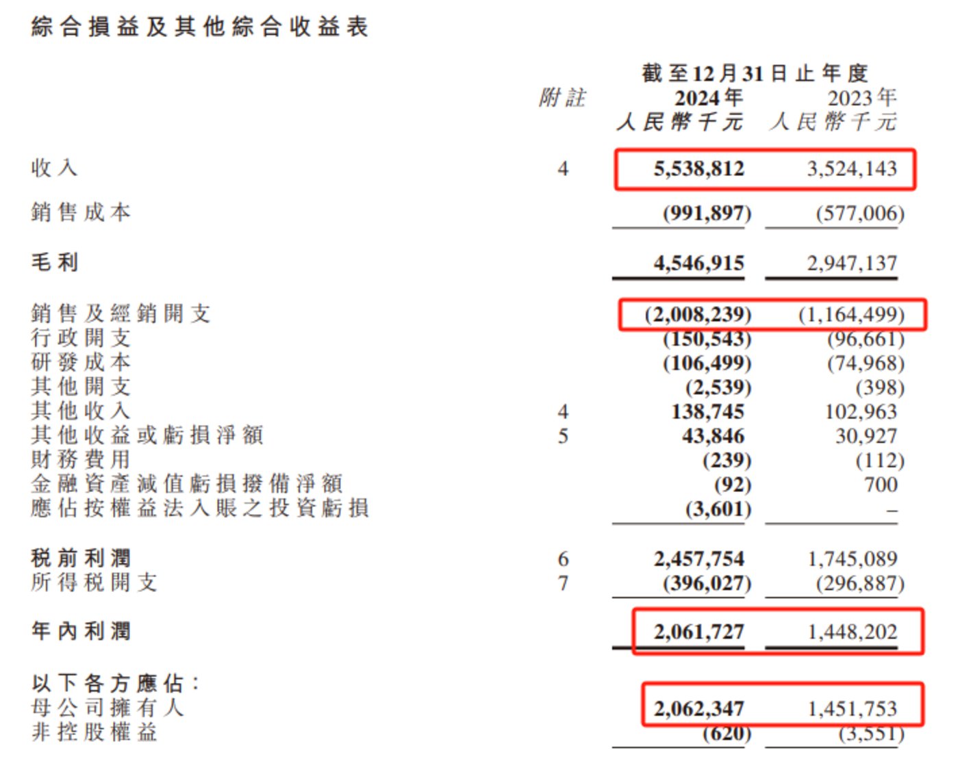 2024年公司来自线上直销渠道收入占到了七成以上,线下直销和经销渠道收入则占据剩余不足三成。全年公司销售费用大增72.5%至20.08亿元,销售费用率为36.25%。